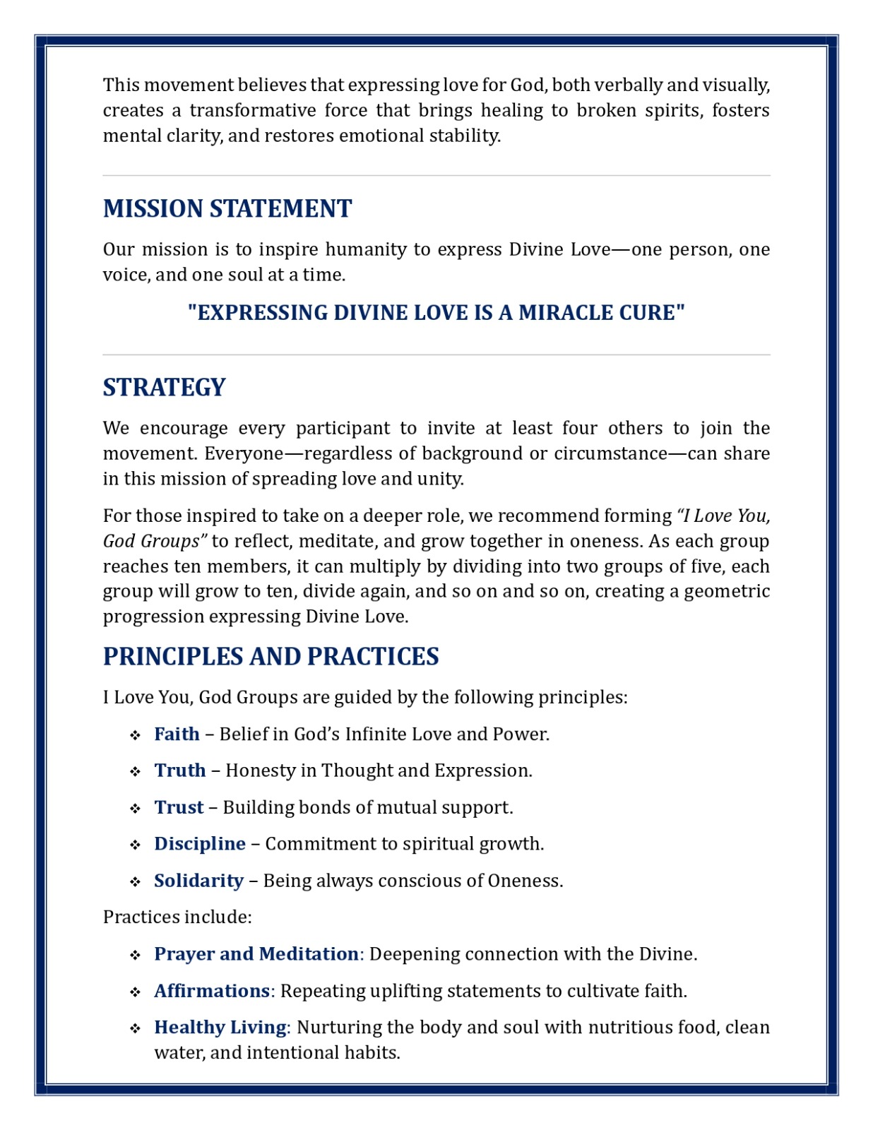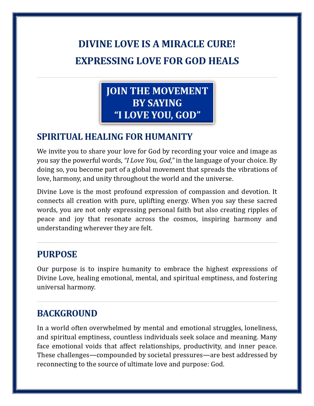 The I Love You, God Movement is a global initiative encouraging individuals to express their love for God through voice, visuals, and community actions promoting healing, harmony, and Divine Love in humanity and the throughout the universe. To join the I LOVE YOU, GOD MOVEMENT, please visit www.ilvugod.com.